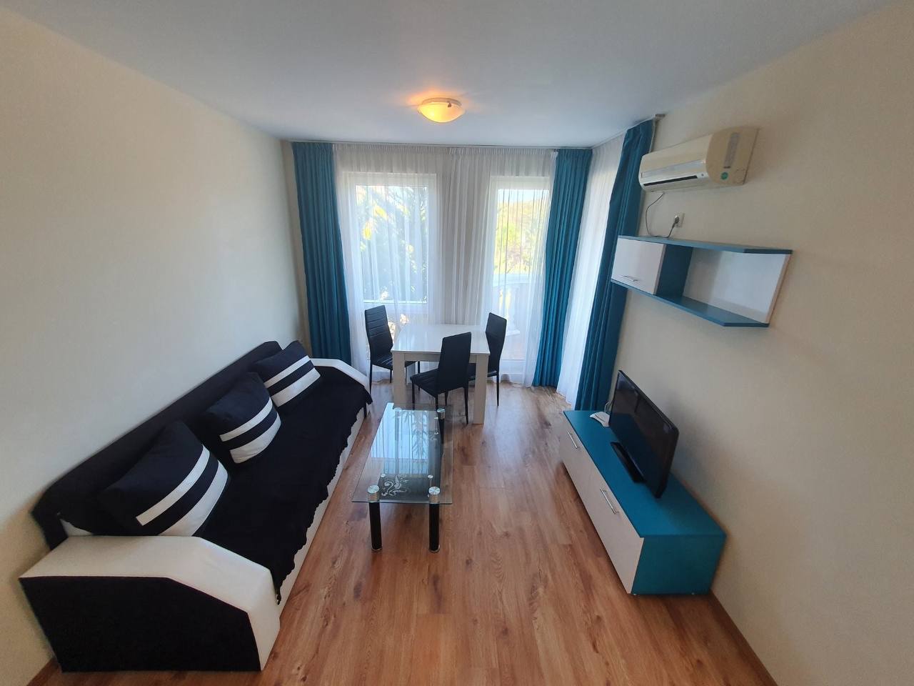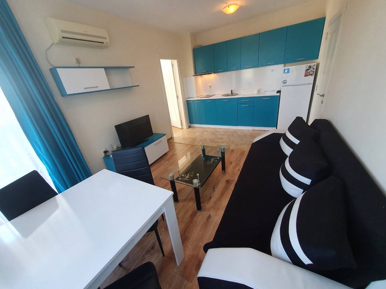 В квартире две спальни, два санузла, гостиная с кухней, терраса с видом на бассейн комплекса