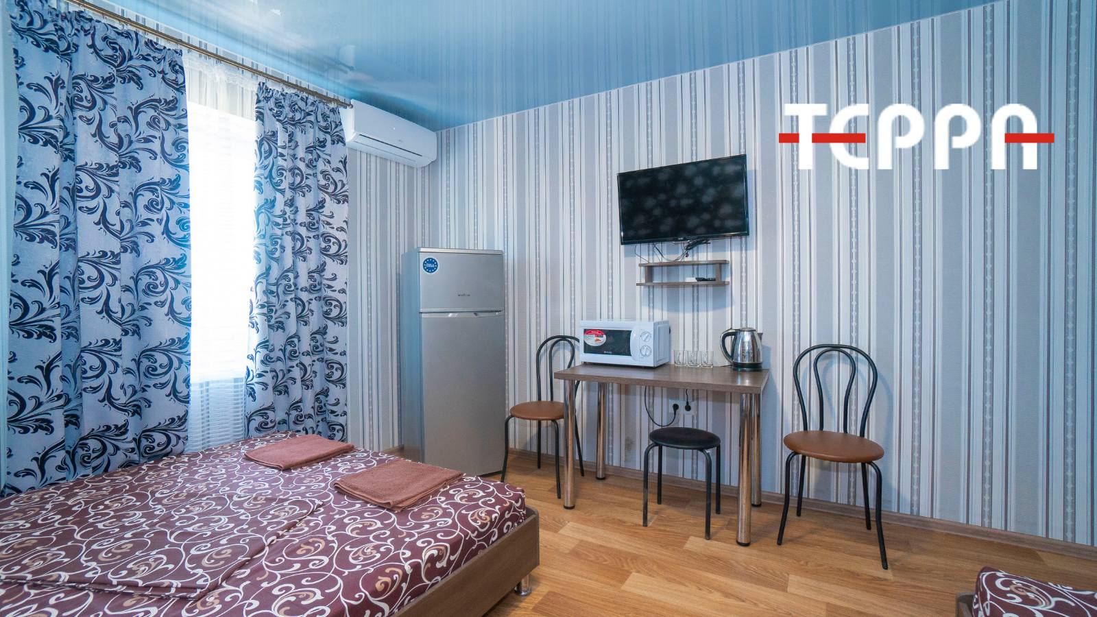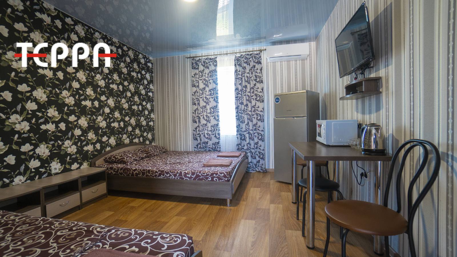 Всё номера меблированы, с бытовой техникой, спутниковое тв, спит-система.