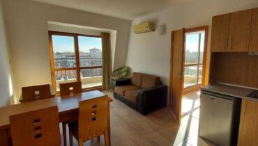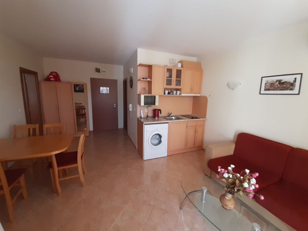 Полностью меблирована: в гостиной кухонная мебель, раскладной диван, тумбочка, обеденный стол и стулья, журнальный столик, шкаф, холодильник, стиральная машина, плита, вытяжка, посуда.